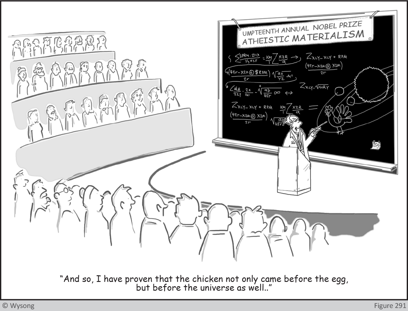 A Big Bang of nothing created an infinite meaningless universe containing atomic dust that gravitationally accreted into heavenly bodies including our Earthball moving in several different directions at 2.8 million mph and holding an atmosphere next to the vacuum of space while spontaneously forming life from primeval sludge that then evolved into complicated rocks called humans with no free will.